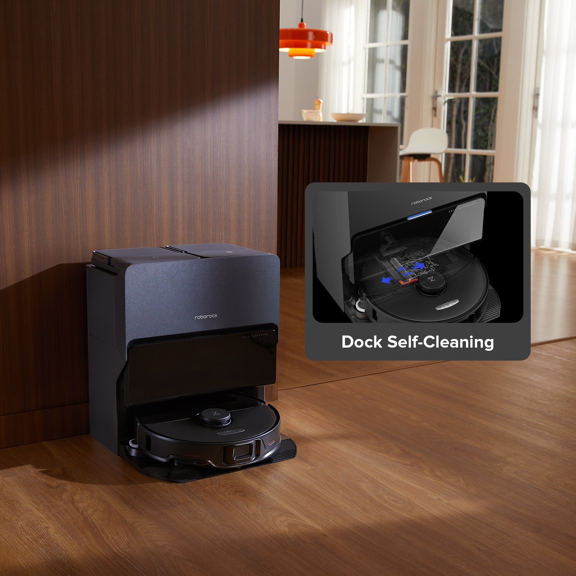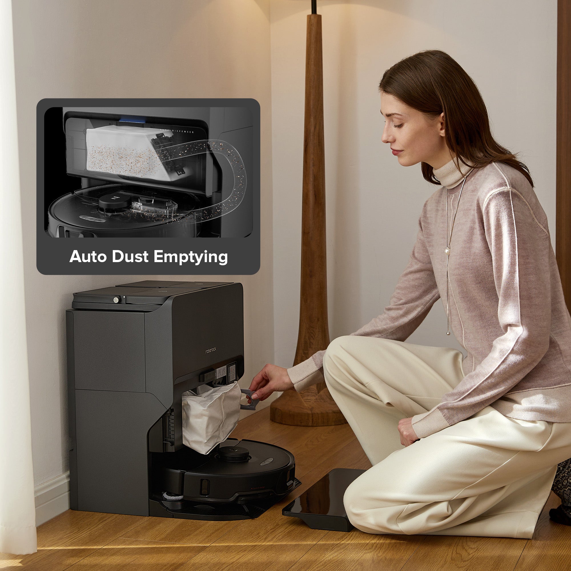 Supports auto dust emptying after cleanups and during cleanups, enhancing efficiency for heavy vacuuming and pet-friendly families, 7 weeks* without emptying.