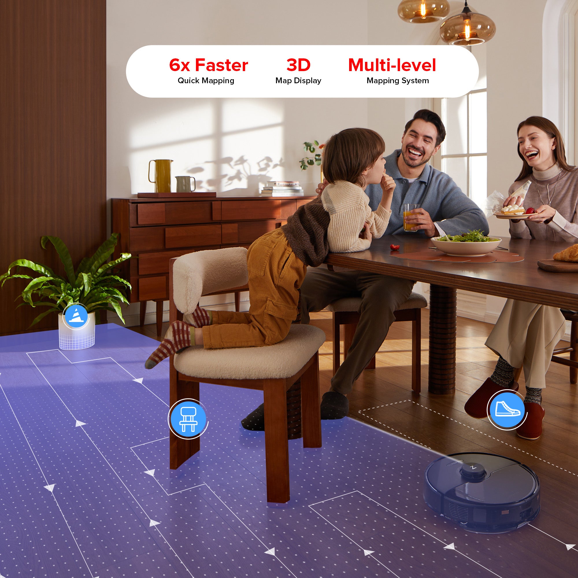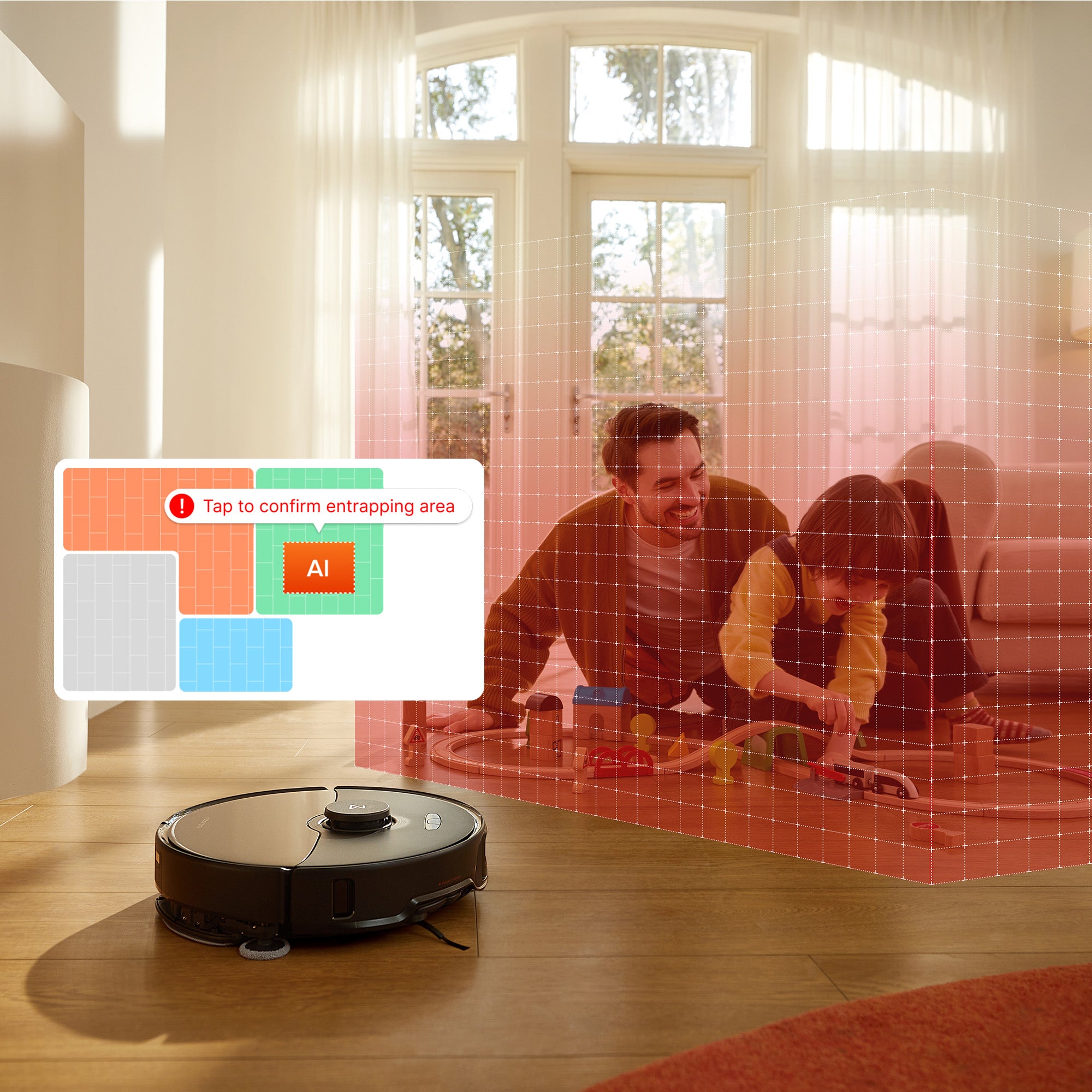 Smart enough to suggest No-Go Zones automatically, your robot is kept safe from falling down the stairs accidentally, or getting stuck in tight spots.