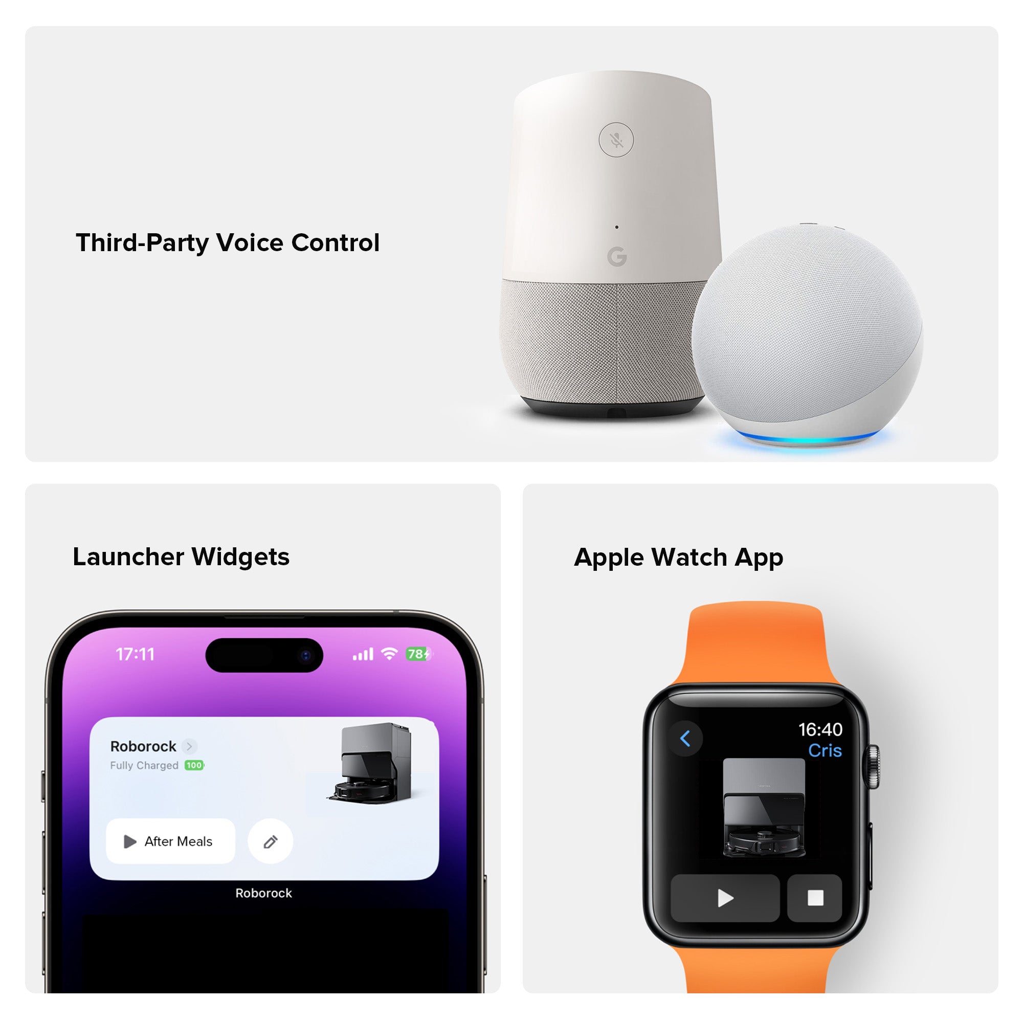 Voice commands via Amazon Alexa, Apple Siri, or Google Home.