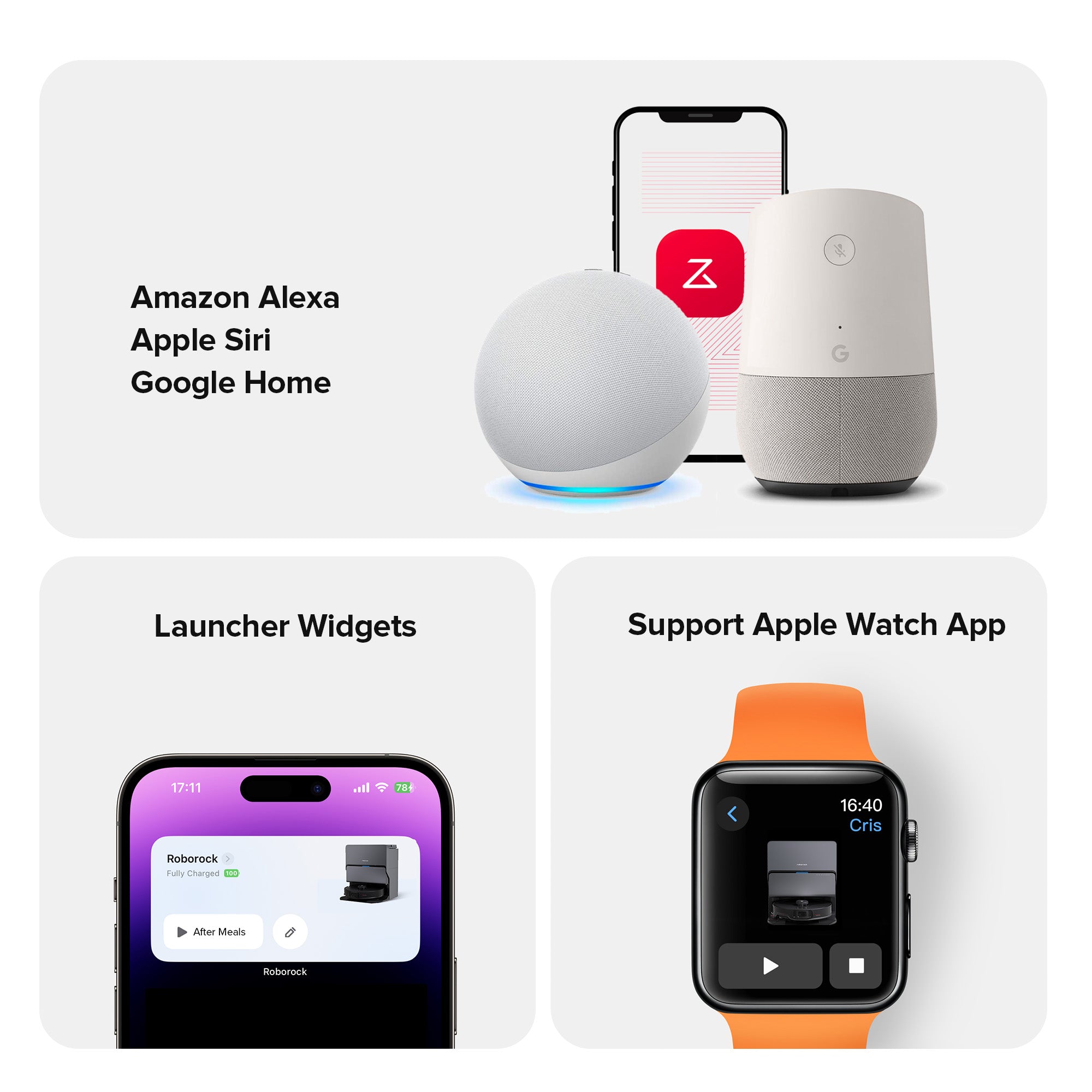 Voice commands via Amazon Alexa, Apple Siri, or Google Home.