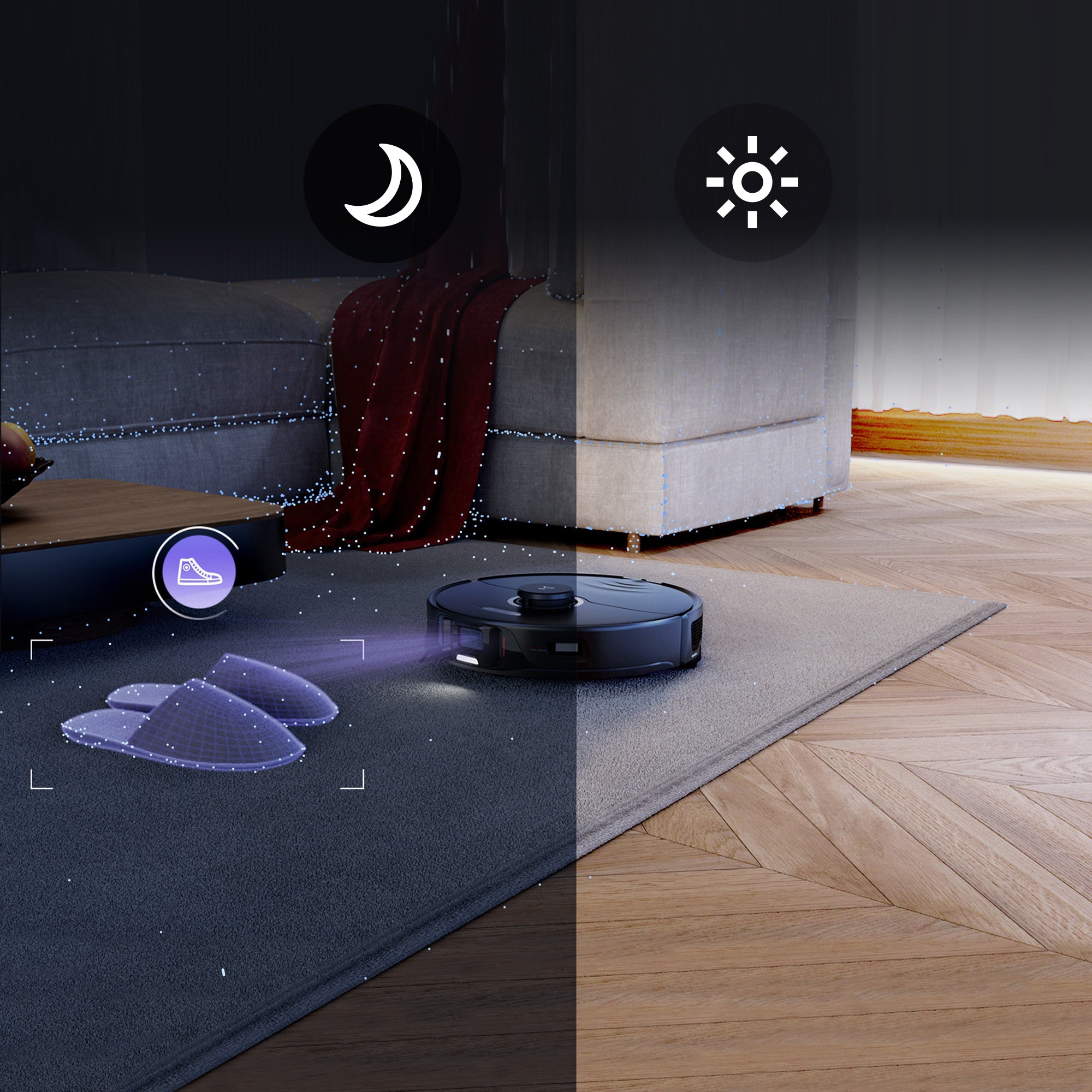 With 3D structured light and infrared imaging technology, Reactive 3D Obstacle Avoidance system can help the robot vacuum identify and avoid potential hazards on the floors, in both bright and dark rooms, bringing you a worry-free cleaning experience.