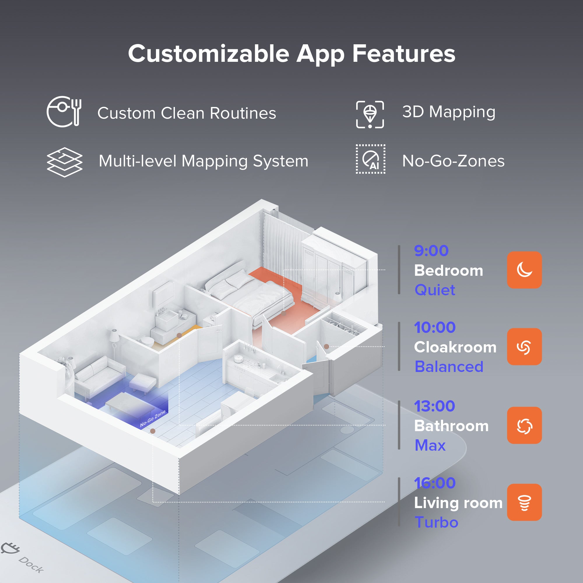 •Custom Cleaning Routines:decide on your time when the robot cleans with custom cleaning schedules, and set cleaning routines for particular areas.