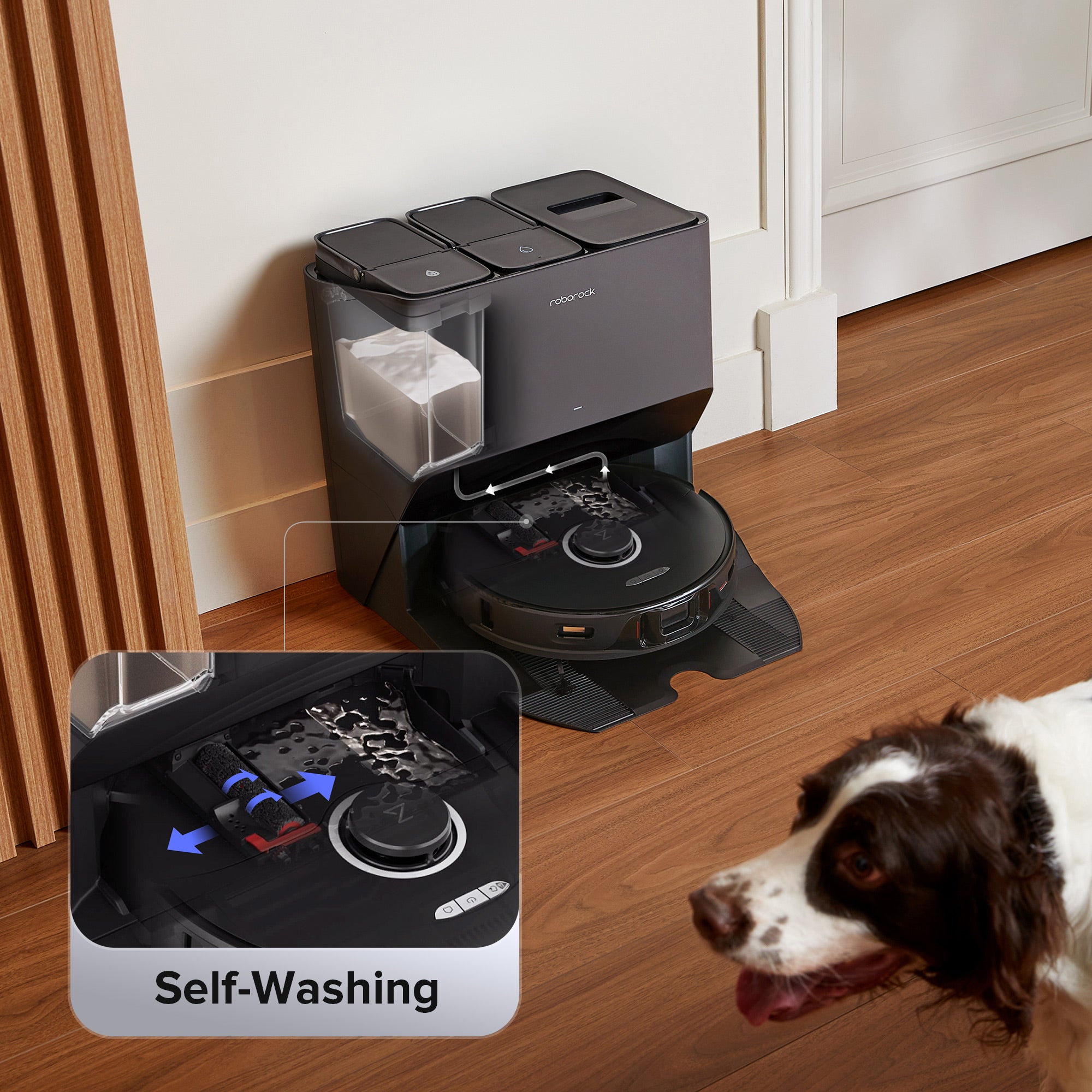 Washes robot mop automatically during cleanup and when finished so you don’t have to after each use.