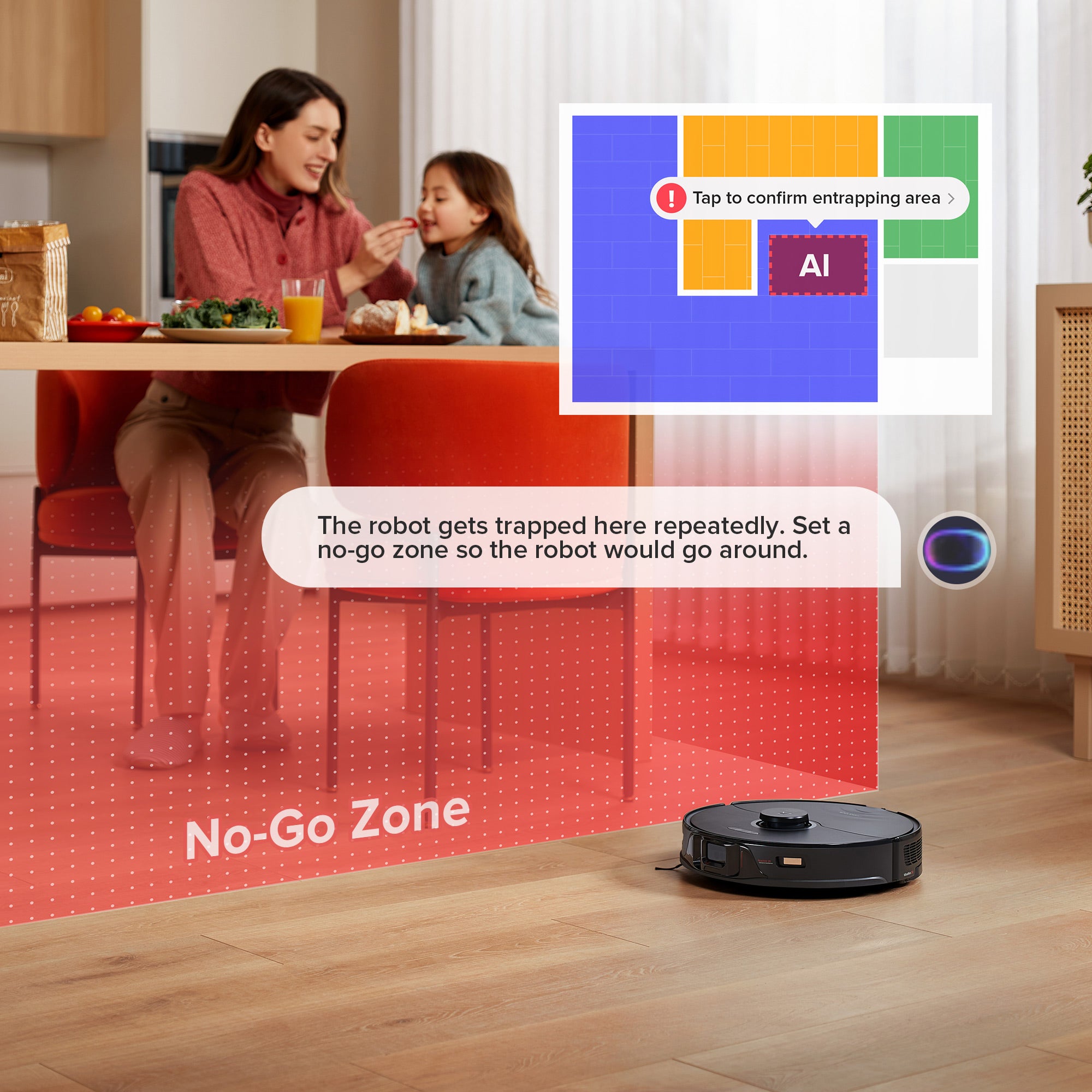 Automatically detects easy-to-get-stuck places and suggests No-Go Zones to prevent your robot vacuum from getting caught in small spaces. You can also draw Invisible Walls that block certain areas from your robot vacuum’s entry in the Roborock App.