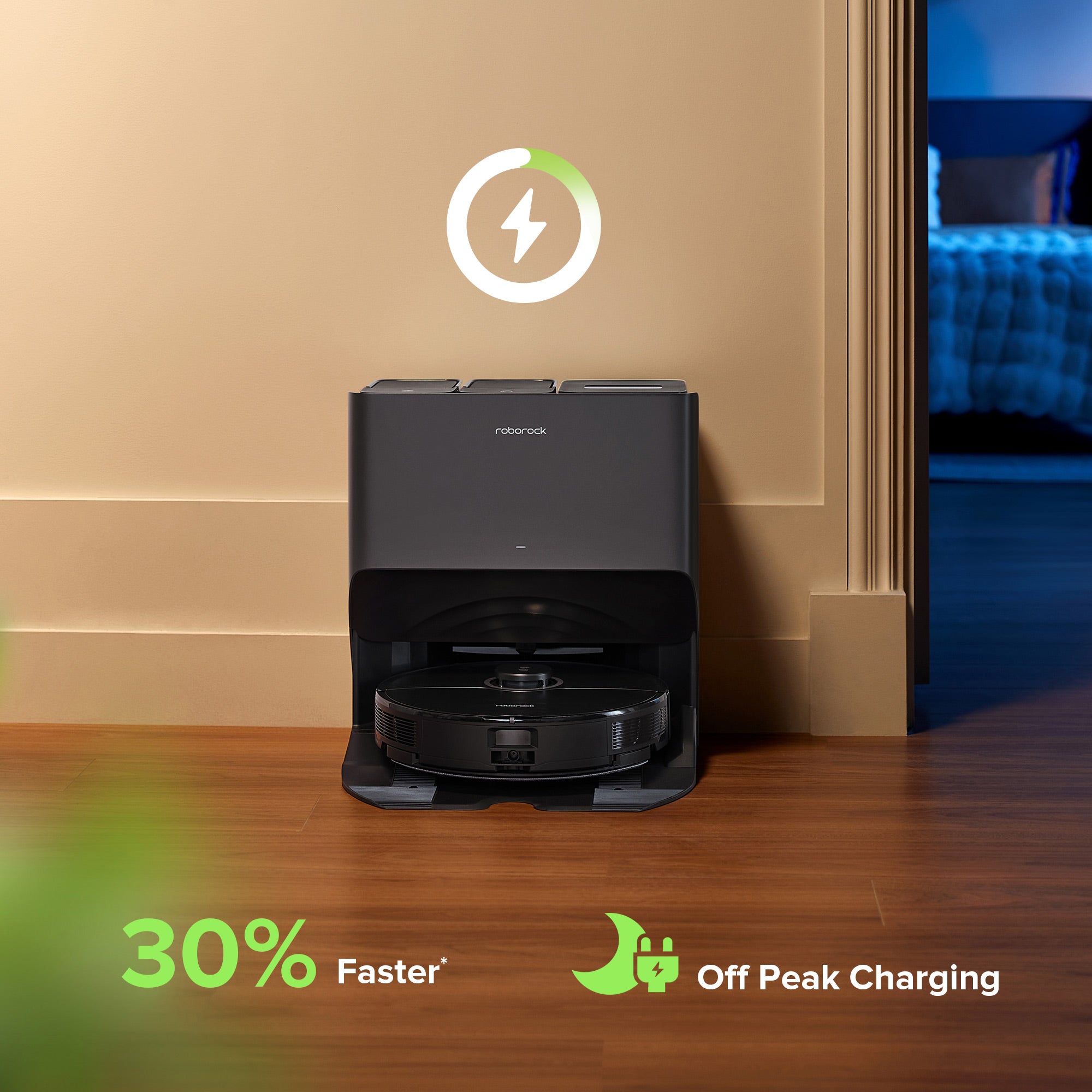 Quickly resumes cleaning by charging 30% faster* than before. You can choose off-peak times to charge to save on power as well as the costs of using peak-time electricity.