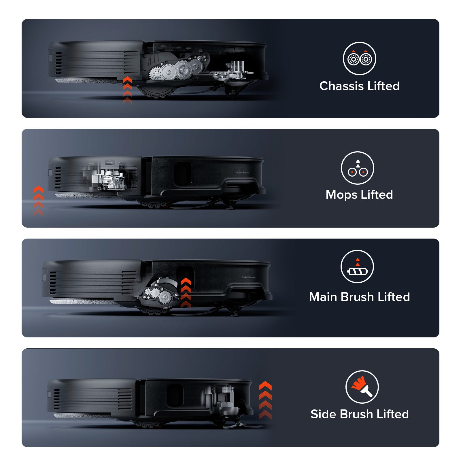 Enhance your cleaning with the AdaptiLift™ Chassis, featuring independently adjustable three-wheel control for versatile lifting. Elevate the entire chassis or adiust the front, rear, left, or right halves independently to conquer complex home environments, ensuringoptimal cleaning coverage.