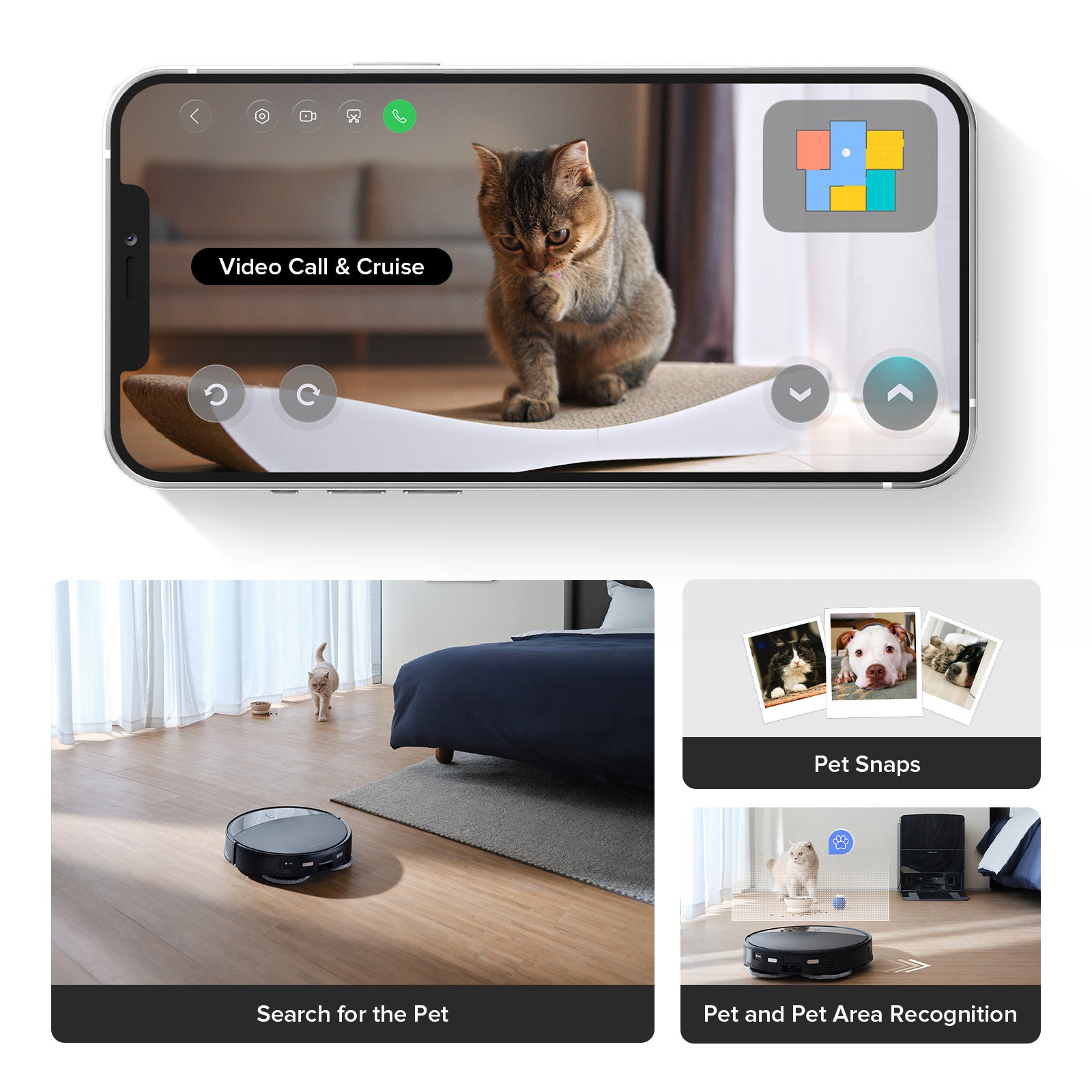 Capture adorable snapshots of your pets during cleanups and easily track them with the app. If your pet is hiding or you're worried they're alone, the robot will help locate them by roaming through your home.