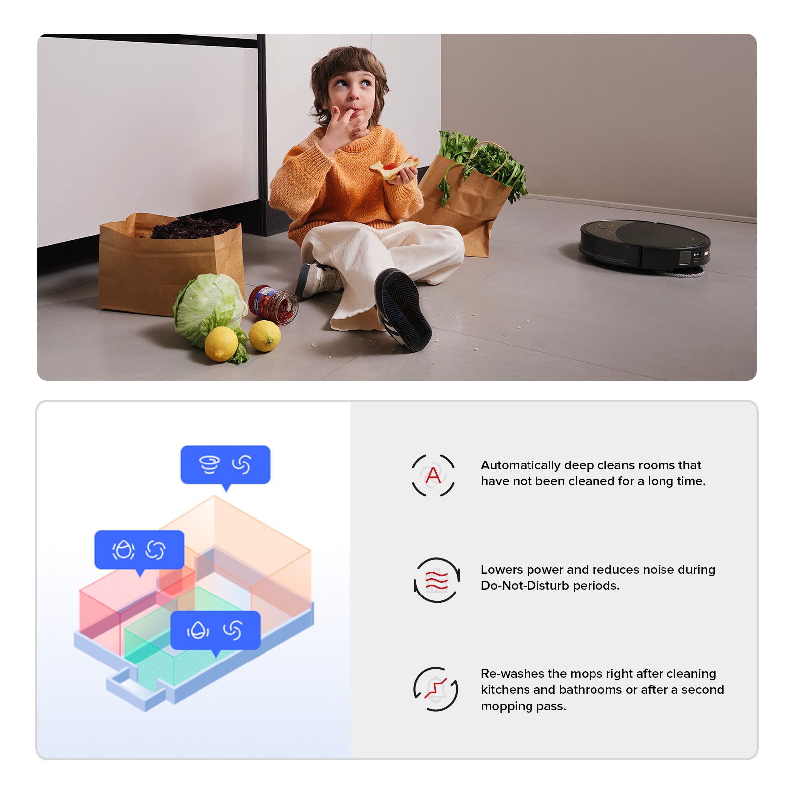 Designed to meet your home's unique needs, the liftable chassis, main brush, side brush, and mops work together to provide automated and adaptive cleaning tailored to various scenarios.