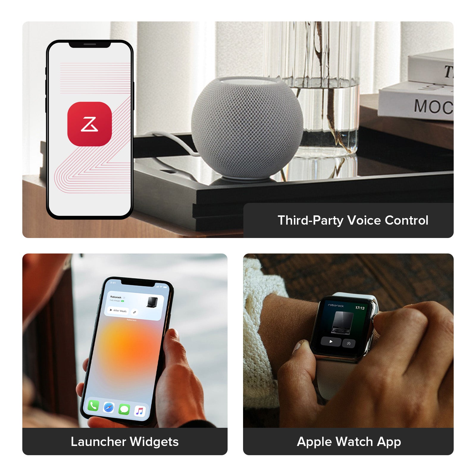 Voice commands via Amazon Alexa, Apple Siri Shortcuts, or Google Home.