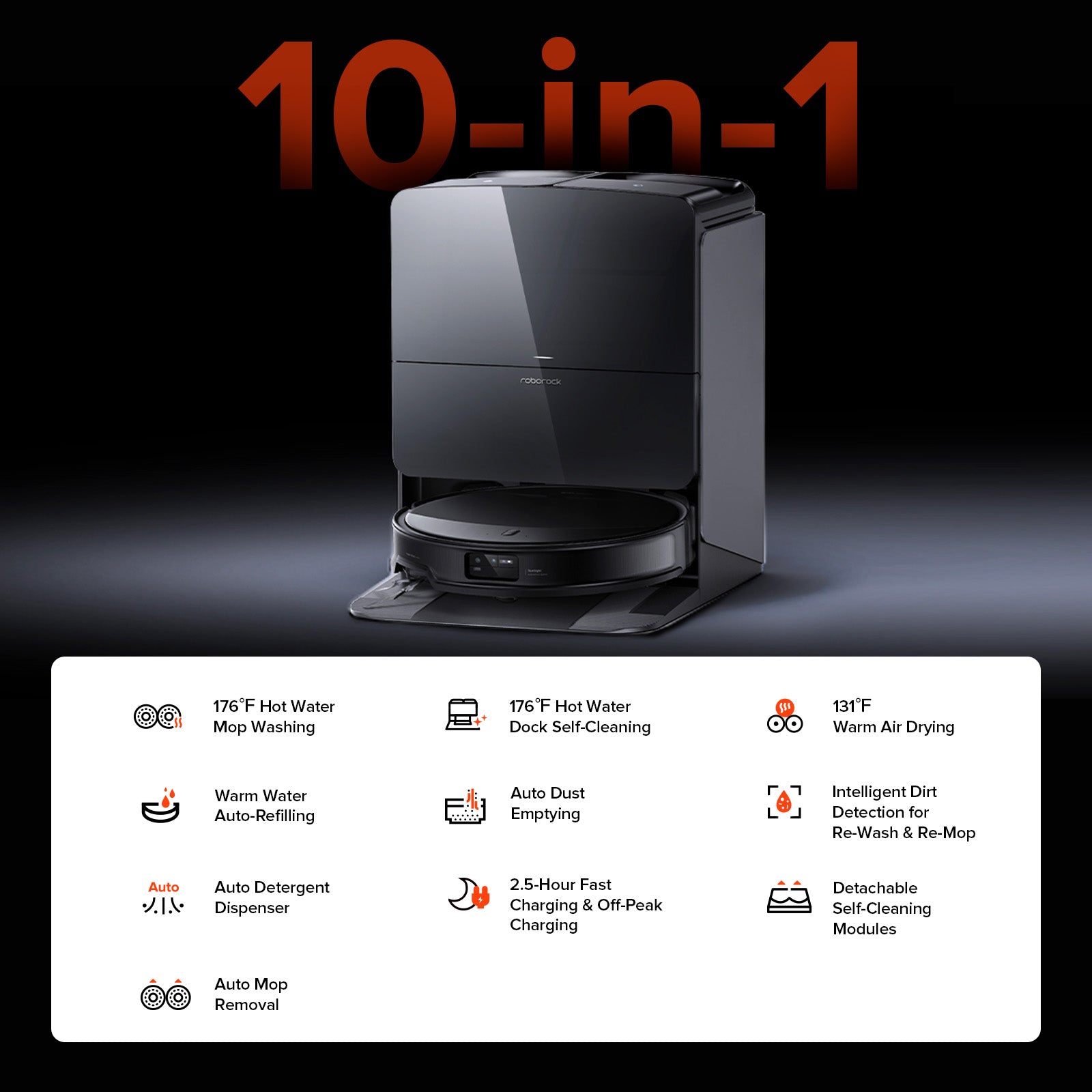 A: It offers up to 80℃ high-temperature mop washing, intelligent dirt detection, automatic refilling of the onboard water tank, auto detergent dispenser, auto-emptying of the onboard dustbin, and warm-air drying of mop cloths.